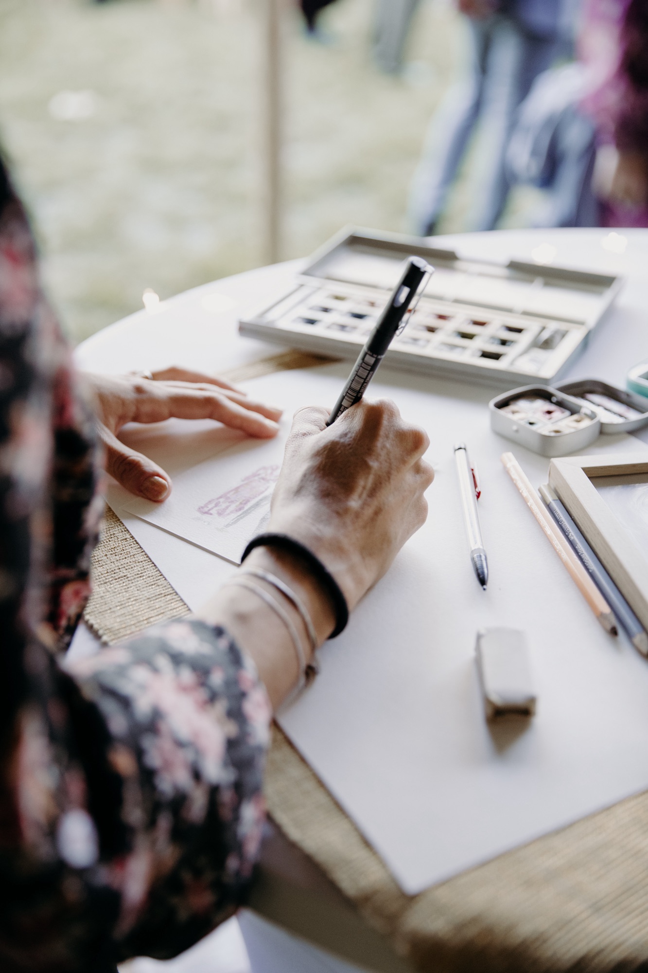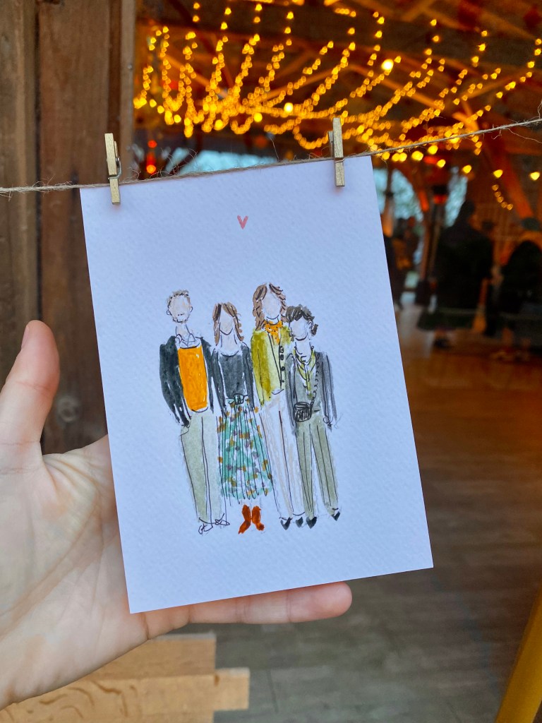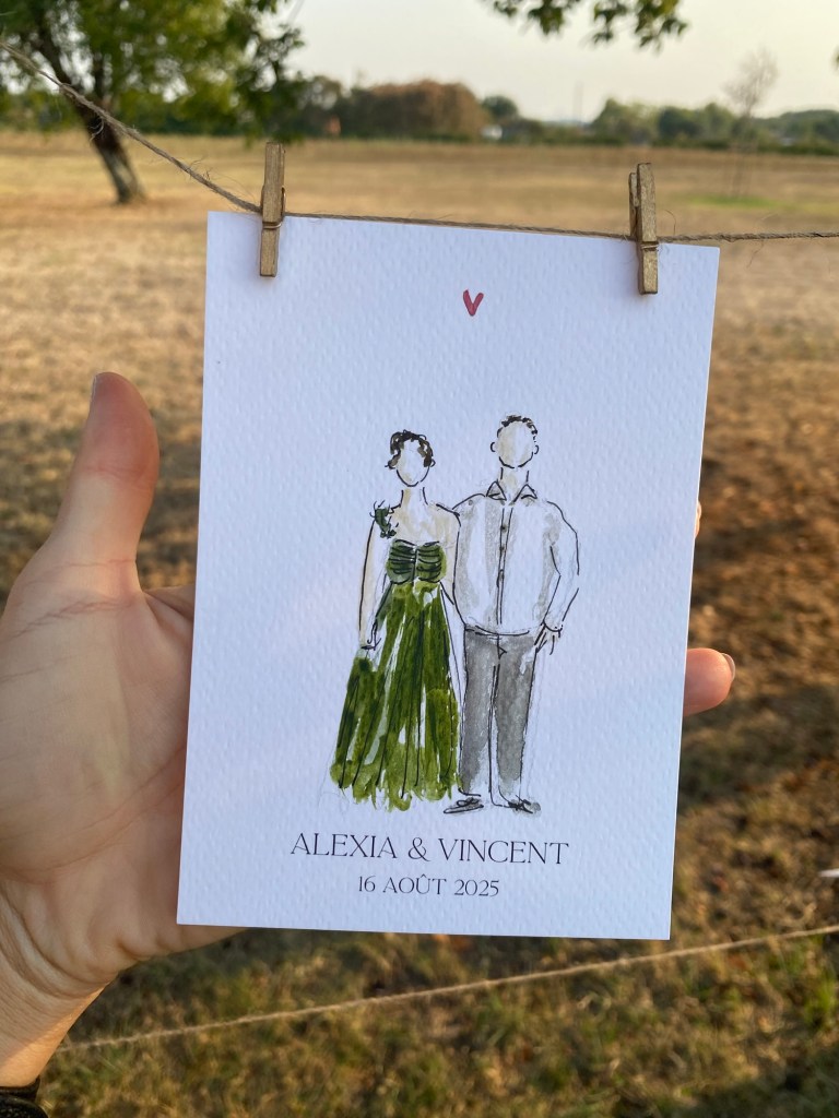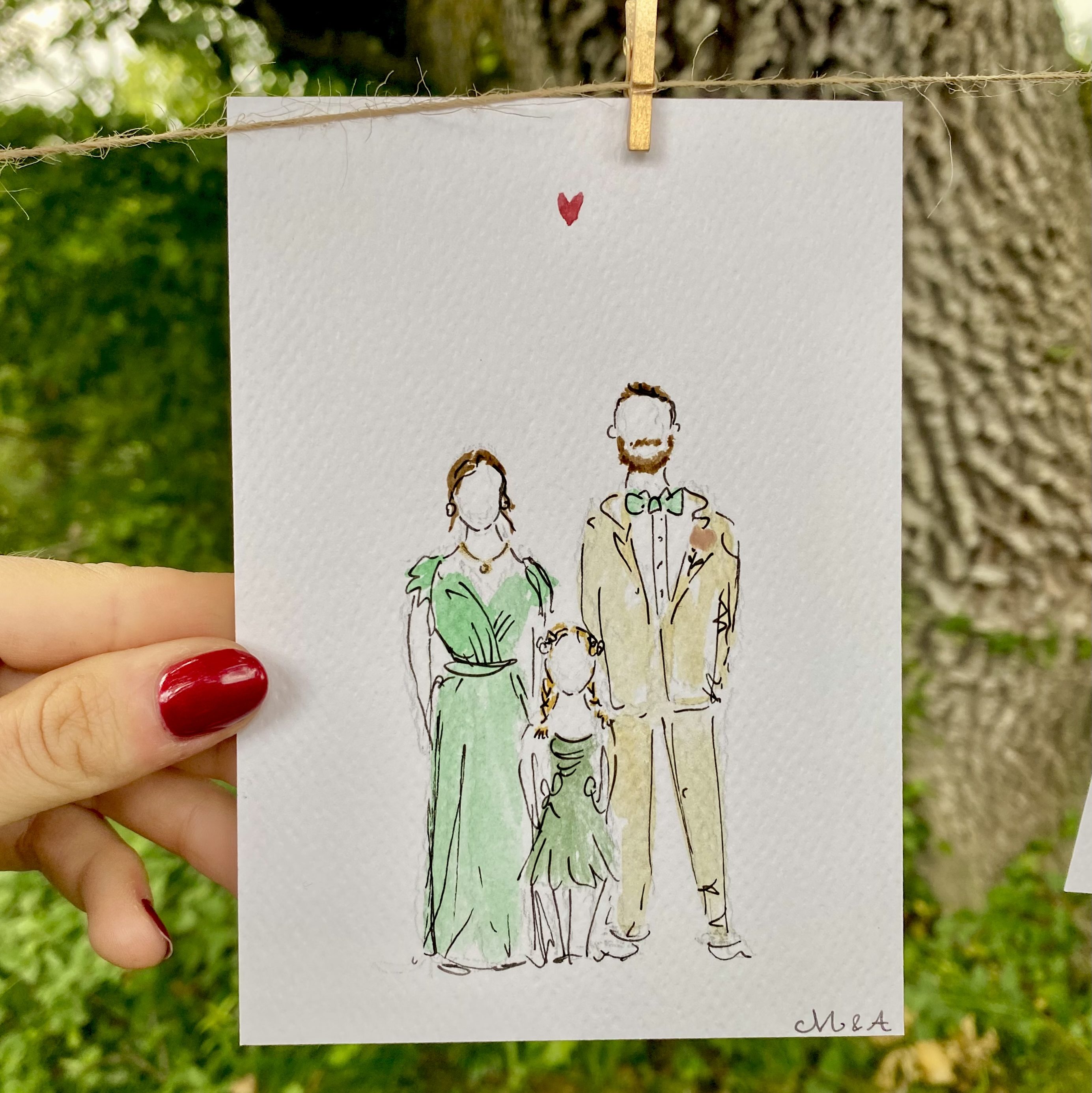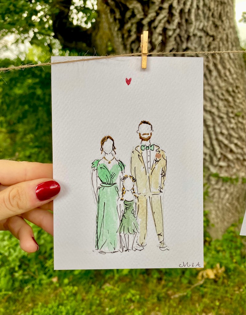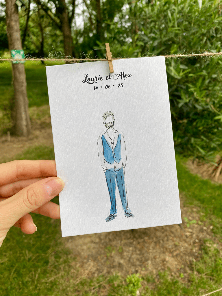 J’arrive 30 mins avant le début de l’événement. J’apporte mon matériel puis je vous peins pendant le temps qui a été convenu. J’ai seulement besoin d’une table à disposition (si possible table haute). Une fois l’aquarelle réalisée, je l’accroche sur mon tableau afin qu’elle sèche bien, puis je recommence avec de nouveaux invités. La récupération de l’aquarelle se fait en autonomie, ils peuvent repasser la récupérer au bout de quelques minutes.